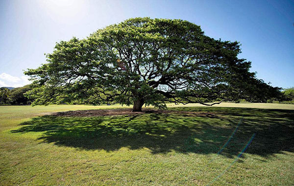 雨樹,落葉大喬木,高可達(dá)25米以上,枝葉繁茂,樹冠巨大圓滿,雨樹長到一定高度之后,便不再向上生長,而是橫向發(fā)叉、增加枝干,隨著頂部枝葉越來越多,形狀越來越像張開的巨形雨傘,其頂部直徑最大可達(dá)30米,夏天遮陽消暑,冬天避風(fēng)御寒。