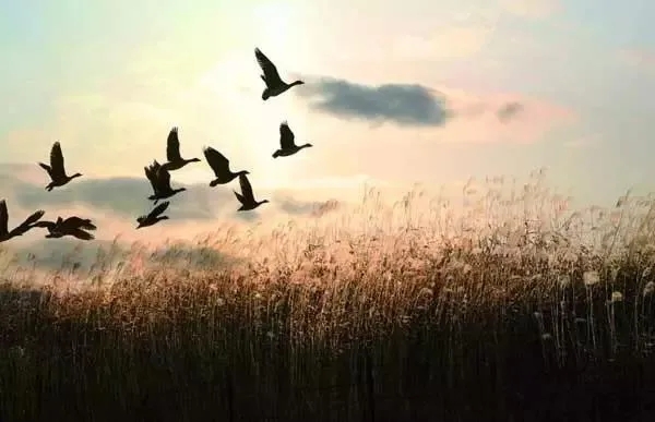 秋風(fēng)起,天氣涼。秋雨淡淡雁成行。棉田白,稻田香,家家農(nóng)人去來忙。紅葉村,蘆花港,處處聽得秋蟲響。